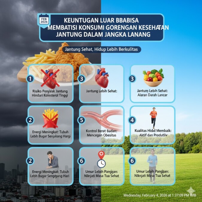 Manfaat terbesar dari membatasi konsumsi gorengan adalah perlindungan kesehatan jantung secara berkelanjutan. Risiko penyumbatan pembuluh darah dapat ditekan, tekanan darah lebih stabil, dan metabolisme tubuh menjadi lebih sehat. Kebiasaan kecil seperti mengurangi gorengan dari menu harian dapat memberikan dampak besar bagi kualitas hidup di masa depan.